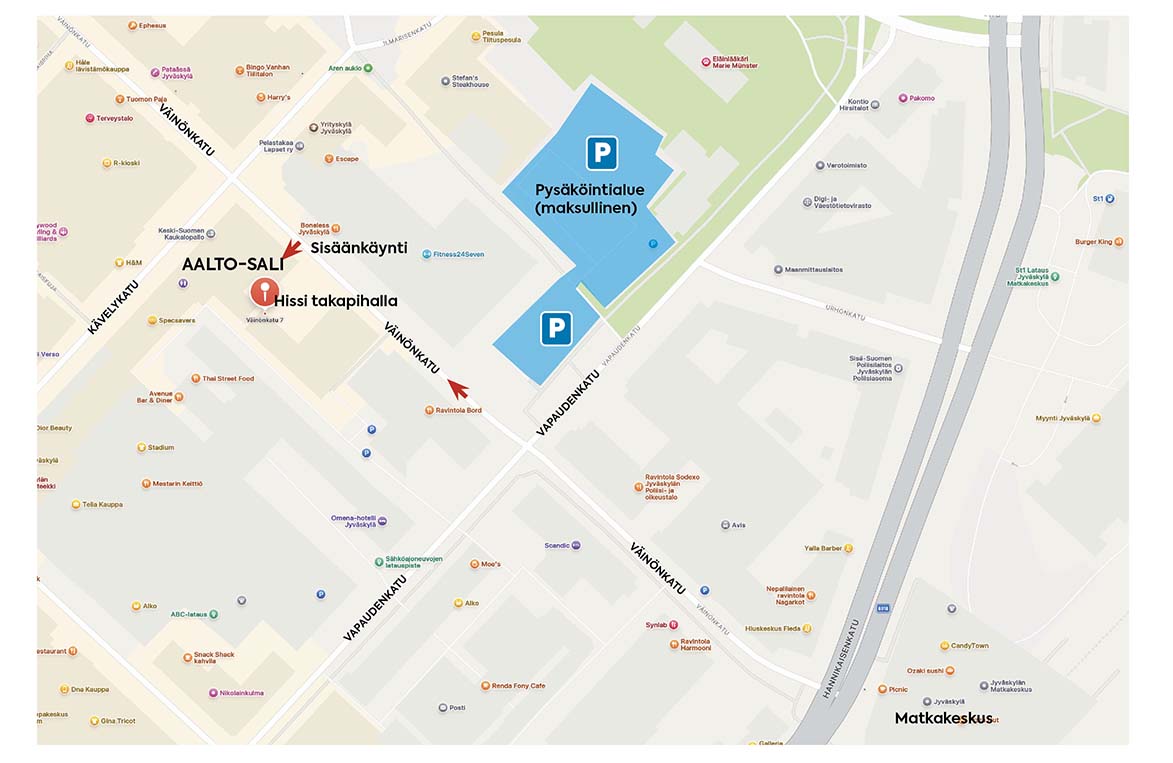 Aalto-sali on aivan Jyväskylän ytimessä, maksullisia parkkialueita löytyy aivan välittömästä läheisyydestä, ja edullisempia noin 600 m säteellä. Katso oheiset karttakuvat. Lastauksen ja purkamisen ajaksi voit ajaa auton aivan Aalto-salin eteen tai viereen pienelle parkkipaikalle.